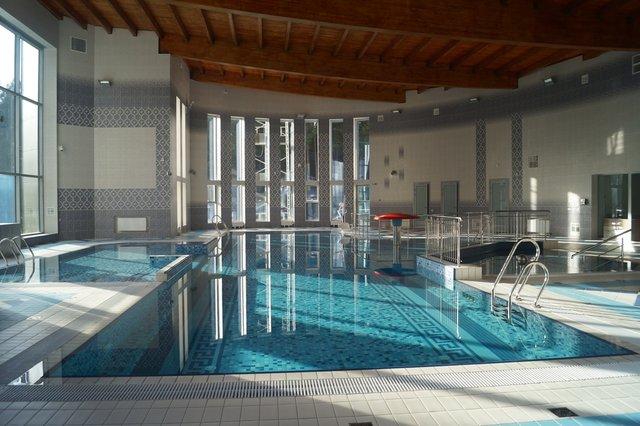 Входит в стоимость (ежедневно, кроме выходных, 1 час по тарифу с лечением). Общая площадь 160 кв. м., максимальная глубина 1,4 м. С пресной подогреваемой водой, водопадом «Зонтик», донными гейзерами, системой противотока. Температура воды в бассейне 29-30 градусов Цельсия. Есть детский бассейн площадью 15 кв. м. и глубиной 0,65 м., с фонтаном и донными гейзерами для маленьких посетителей санатория. Температура воды в детском бассейне 30-31 градусов Цельсия.