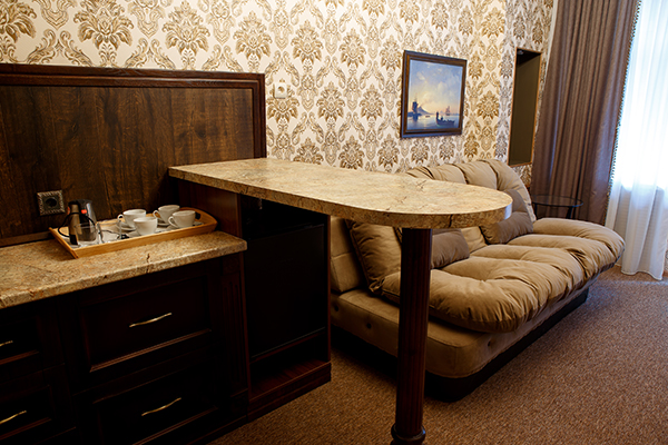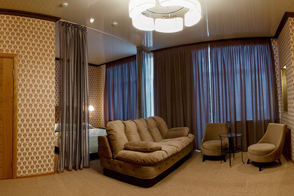 В номере: кровать двуспальная, вешалка, зеркало, набор мягкой мебели, стол, стулья, шкаф, телевизор, телефон, холодильник, чайный набор посуды, электрочайник.