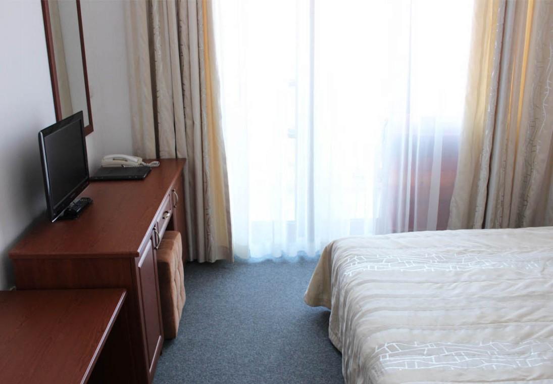 В номере: кровать, комнатная мебель, система кондиционирования и отопления, телевизор, телефон, посуда, чайник, холодильник.
