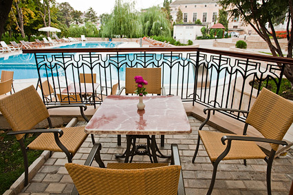 Входит в стоимость. Вода пресная, подогреваемый. Общая площадь 275 кв.м. Оснащён каскадом, массажными струями и детским отделением. Здание отеля соединено с бассейном теплым крытым переходом, что позволяет посещать его в халате при любых погодных условиях. Работает круглогодично.